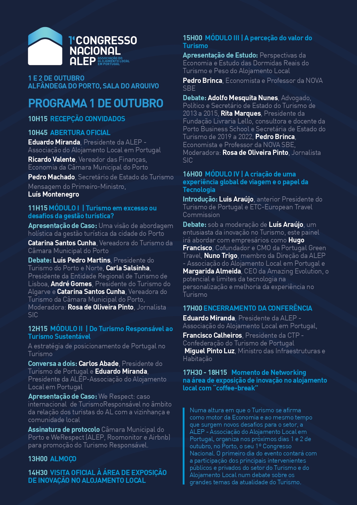 PROGRAMA DIA 2 DE OUTUBRO - DIA EXCLUSIVO PARA PROFISSIONAIS DE ALOJAMENTO LOCAL: