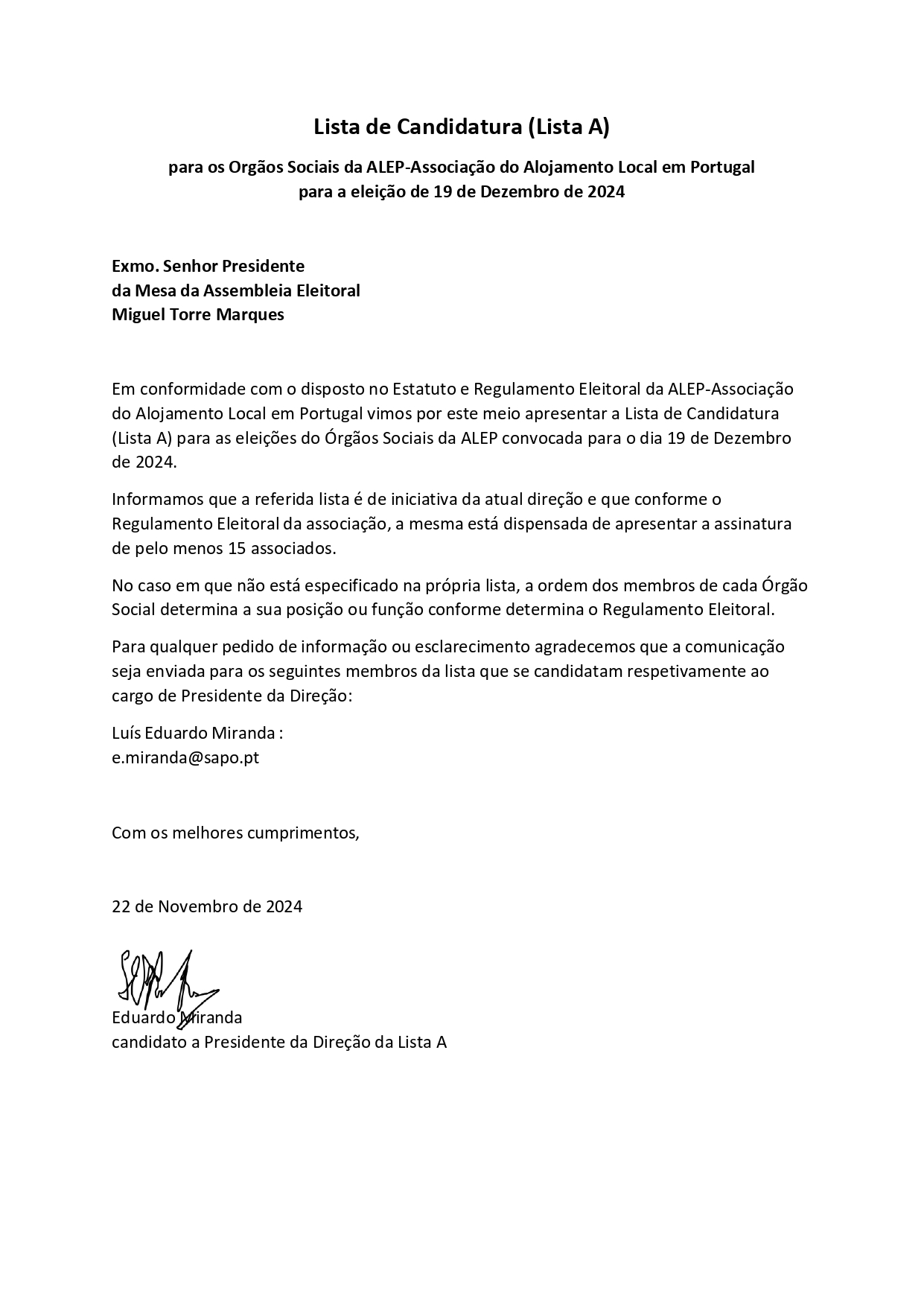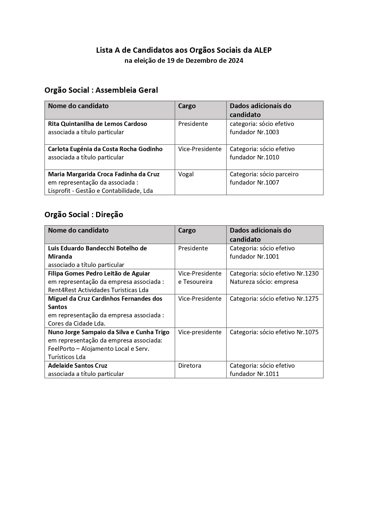 A Mesa Eleitoral da ALEP já recebeu as candidaturas e respetivos programas e informa que houve uma única candidatura denominada por "Lista A" cuja informação sobre os candidatos aos vários órgãos sociais, bem como o programa para o mandato 2025-27, encontram-se disponíveis abaixo.